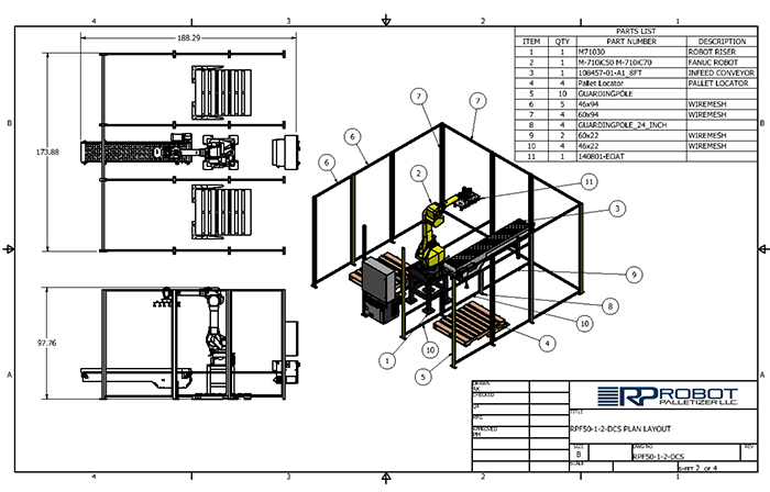 Model RPF50-1-2-DCS is a semi-automated palletizing system that is versatile and cost effective. Robot Palletizer has pre-engineered our systems to provide compact modules that are easy to set up and operate. Pallets are manually placed and removed in and out of the cell providing a cost effective palletizing solution. RPF50-1-2-DCS Robot Palletizer can be delivered withing 6 to 8 weeks ARO.