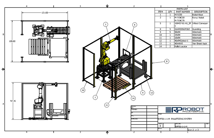 Model RPF50-1-1-M is a semi-automated palletizing system that is versatile and cost effective. Robot Palletizer has pre-engineered our systems to provide compact modules that are easy to set up and operate. Pallets are manually placed and removed in and out of the cell providing a cost effective palletizing solution. RPF50-1-1-M Robot Palletizer can be delivered withing 6 to 8 weeks ARO.