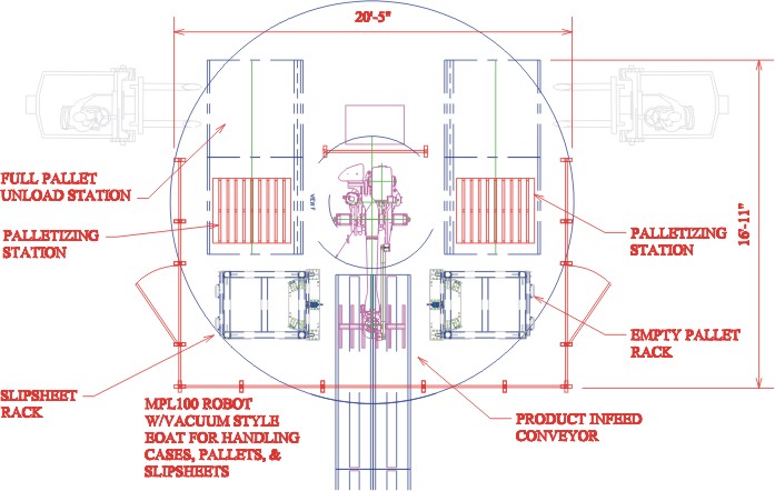 Model RPM-1000-22-A is a automated palletizing system that is versatile and cost effective. Robot Palletizer has pre-engineered our systems to provide compact modules that are easy to set up and operate. Pallets & slip sheets are placed by the robot providing a cost effective palletizing solution. RPM-1000-22-A Robot Palletizer can be operational withing 4 to 6 weeks ARO.